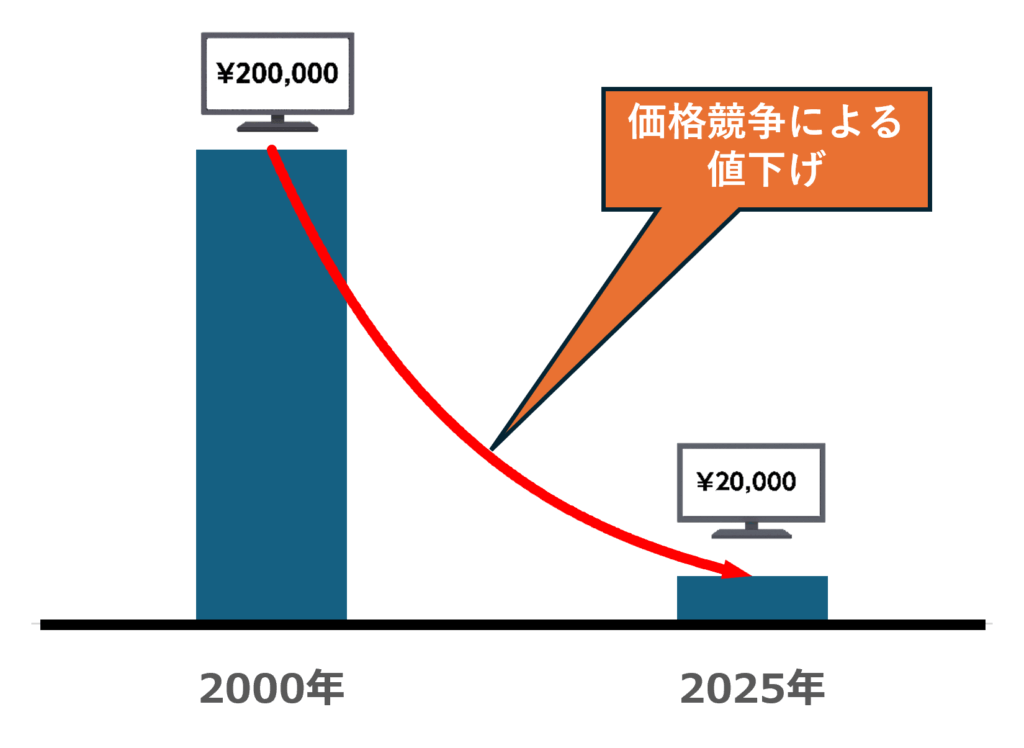 実際2000年前後の日本のテレビメーカーは儲けまくっていたのです。それが今は、安いものでは2万円くらい。つまり、テレビの価格は25年間で10分の1になっています。