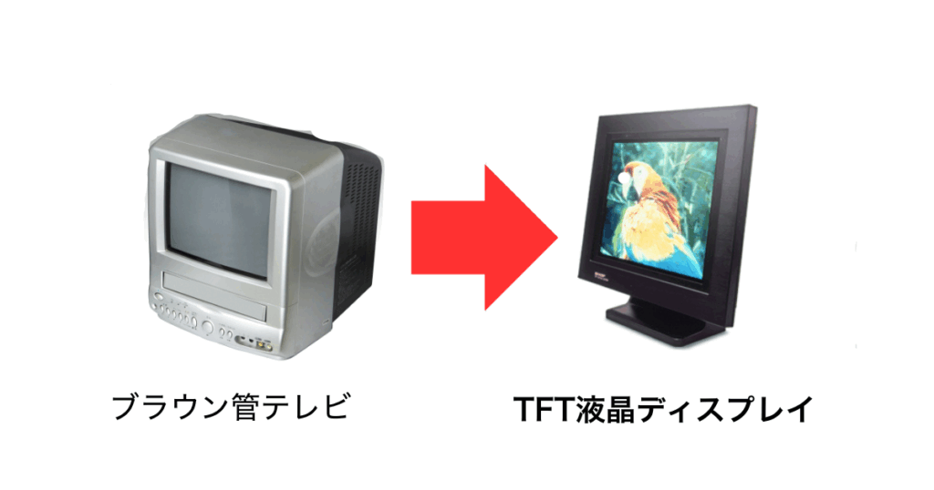 その後、1988年にシャープによって「テレビ用14インチTFT液晶ディスプレイ」が発売されました。この液晶テレビはそれまでのブラウン管テレビとは仕組みが根本的に違い、格段にコンパクトになっていました。